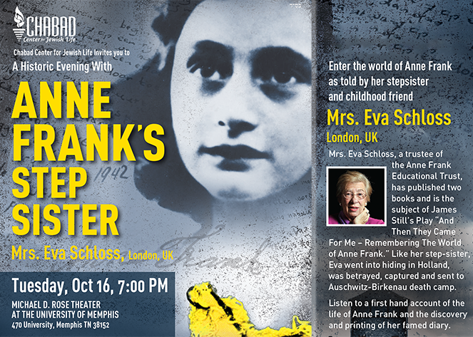 Eva Schloss, the surviving 89-year-old stepsister of the famed Anne Frank, will share her stories about the Holocaust and its consequences at the Michael D. Rose Theater at the University of Memphis at 7 p.m. on Tuesday, Oct. 16. Tickets are available via the event website or by calling (901) 754-0404.